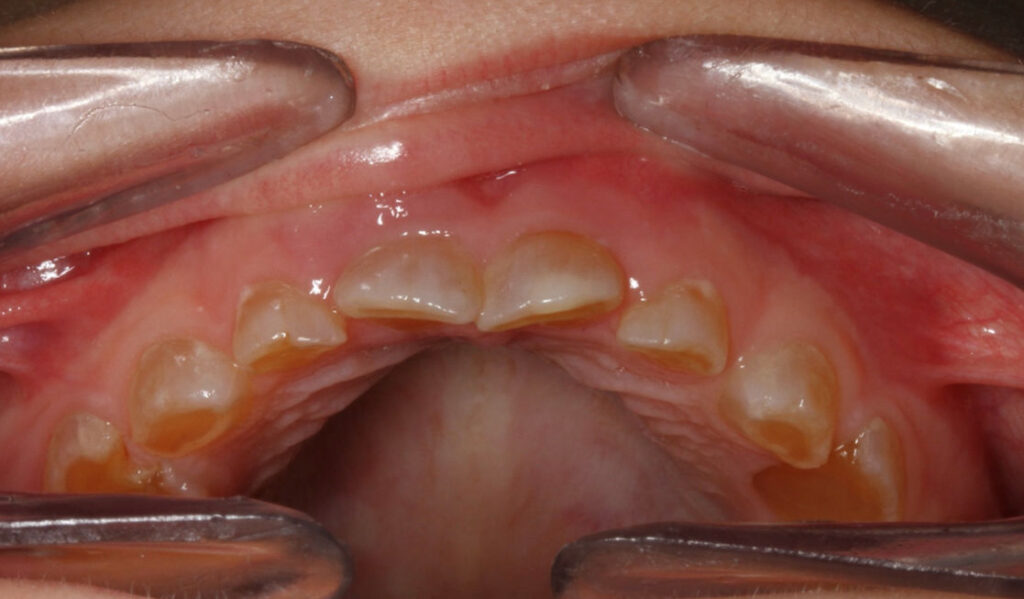 An 8-year-old girl with unusually colored primary teeth.
