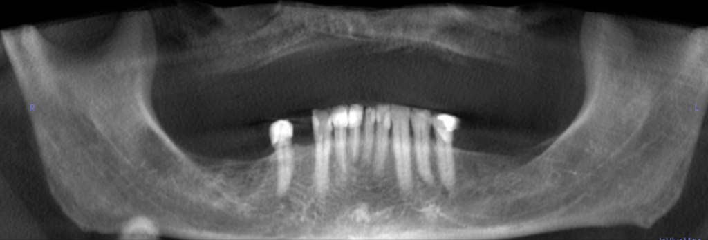 A 53-year-old man with an unusual radiolucency at the inferior border of the left mandible.
